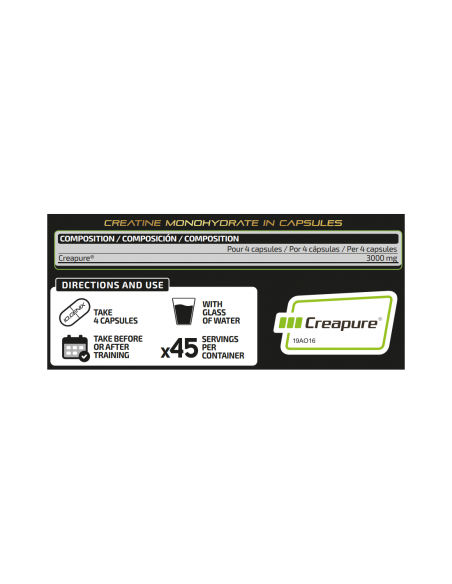 Creatina monohidrato 100% Creapure® en cápsulas vegetales. 180 cápsulas por bote. 45 servicios (dosis diaria recomendada de 4 cápsulas)