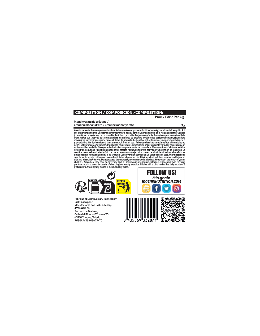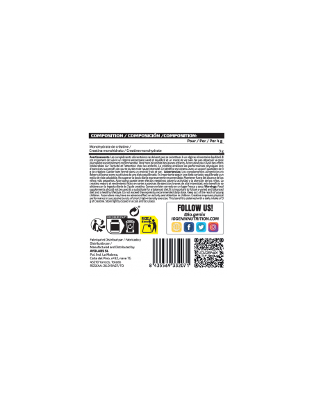 Ingredientes: Creatina monohidrato. Puede contener trazas de gluten (trigo y avena), huevos, leche, pescado y soja. Contiene cazo dosificador de 5 ml (1 cazo raso = 3 g). Lote / Consumir preferentemente antes del fin de: ver envase.