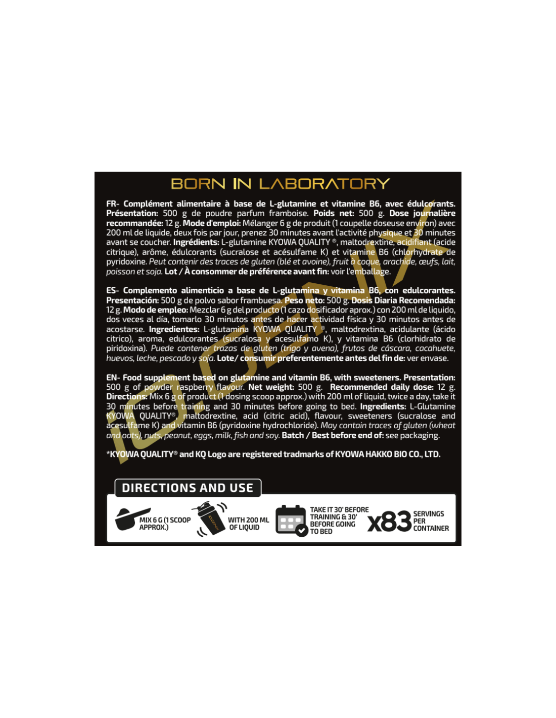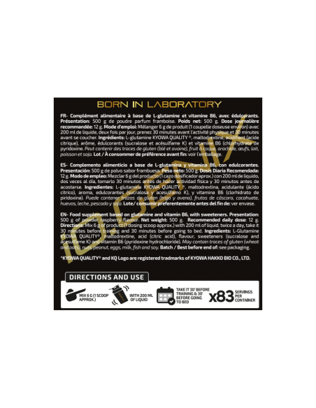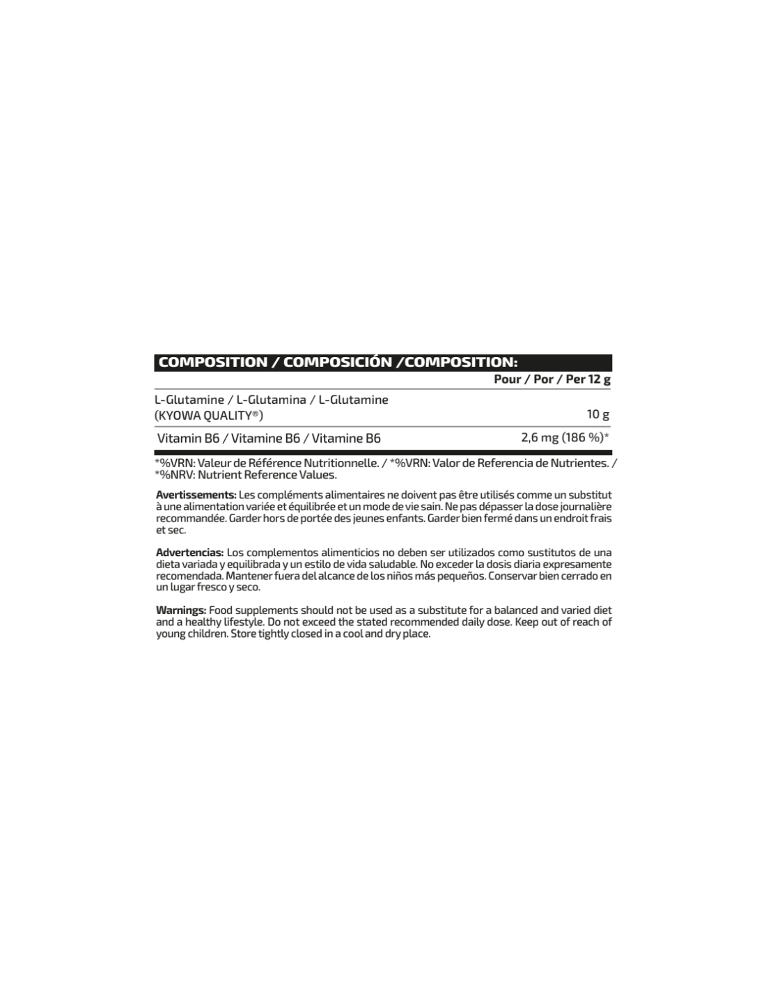 Ingredientes: L-glutamina Kyowa Quality®, maltodextrina, acidulante (ácido cítrico), aroma, edulcorantes (sucralosa y acesulfamo K) y vitamina B6 (clorhidrato de piridoxina). Puede contener trazas de gluten (trigo y avena), huevos, leche, pescado y soja.