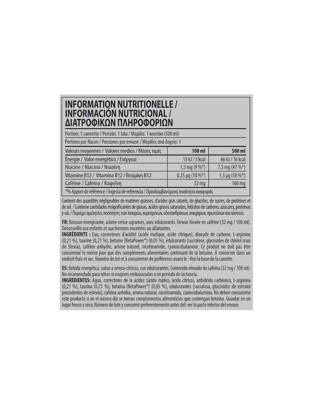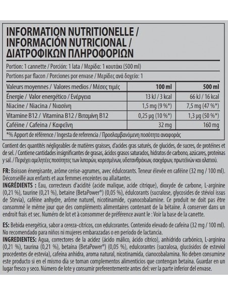 Niacin (as Niacinamide), Vitamin B12 (as Methylcobalamin), Potassium, Explosive Performance Energy Blend (Citrulline Malate, CarnoSyn® Beta-Alanine, BetaPower® Betaine Anhydrous, N-Acetyl-L-Tyrosine, Caffeine Anhydrous (150mg)), Carbonated Water, Citric Acid, Potassium Sorbate (preservative), Sucralose, Natural & Artificial Flavors, Acesulfame Potassium
