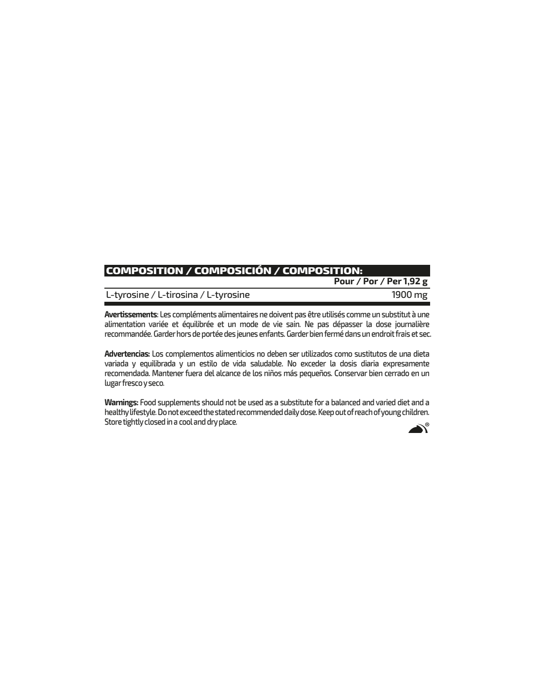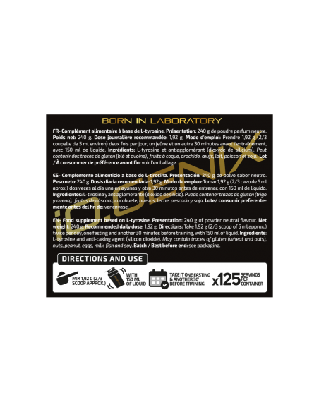 Ingredientes: L-tirosina y antiaglomerante (dióxido de silicio). Puede contener trazas de gluten (trigo y avena), huevos, leche, pescado y soja.