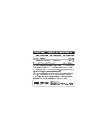 La berberina puede utilizarse junto a minerales como el Cromo. Este mineral contribuye a mantener niveles normales de glucosa en sangre y ayudar al metabolismo normal de los macronutrientes. Por ello, desde el equipo de expertos de iO.GENIX hemos elegido minuciosamente las cantidades efectivas de ambos ingredientes para que actúen sinérgicamente.