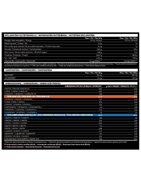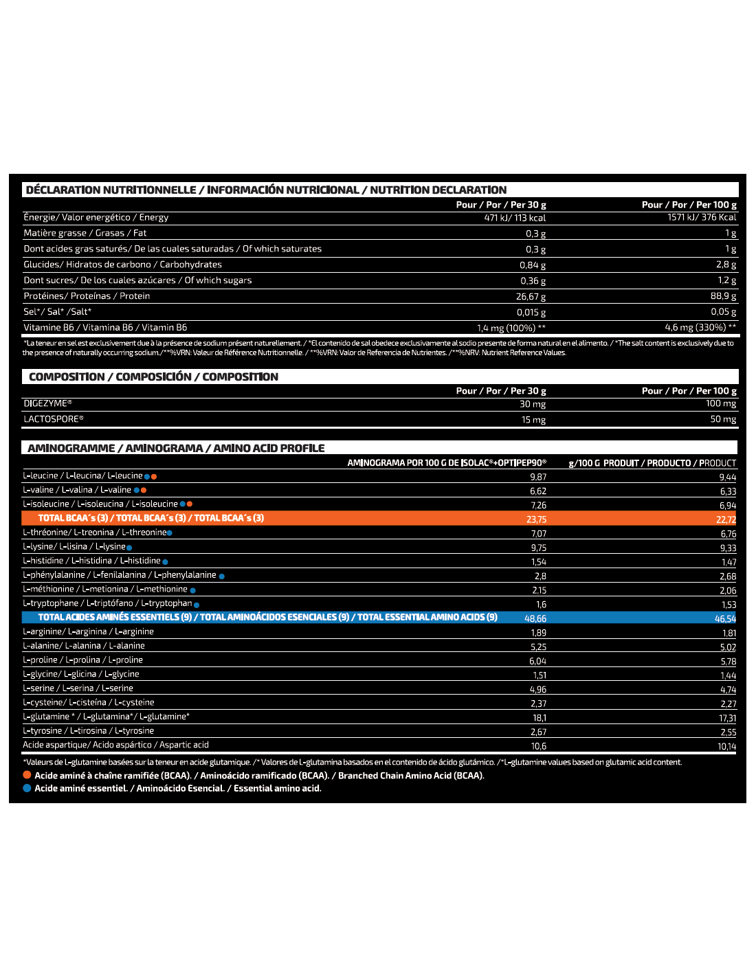 Dos materias primas top. Aislado de proteína de suero de leche isolac ® y aislado de proteína de suero de leche hidrolizada Optipep ®, consiguiendo un % muy alto de proteína y bajo del resto de macronutrientes.