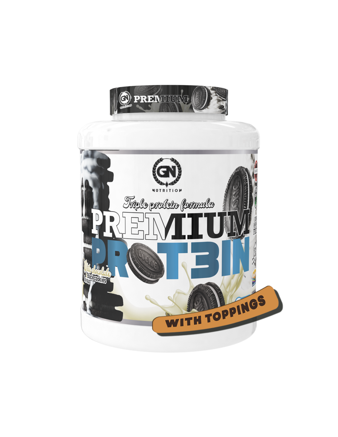 Premium PROT3IN de GN es un complemento proteico en preparado en polvo a base de proteínas y suero lácteo, con azúcar y edulcorantes, enriquecido con vitamina B6. Disponible en 8 deliciosos sabores.