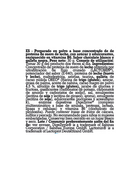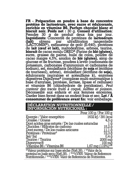 Concentrado de proteína de suero de leche obtenida por ultrafiltración de flujo cruzado (LACTOMIN®), potenciador del sabor (E-640), proteína de leche (huevo y leche), cacao desgrasado en polvo, maltodextrina, trocitos de galleta KIT KAT® ([harina de trigo (gluten), azúcar, grasa de palma, almidón de trigo (gluten), emulgente (lecitina de soja), sal], azúcar, manteca de cacao, cacao, leche desnatada en polvo, suero de leche en polvo, grasas vegetales (palma, karité), grasa láctea, emulgentes (lecitinas), aroma natural de vainilla), taurina, aromas, emulgente (lecitina de soja), yogurt (leche) en polvo, edulcorantes (sucralosa y acesulfamo k), enzimas digestivas DigeZyme ® (complejo multienzimático a base de amilasa, proteasa, lactasa, lipasa y celulasa) y vitamina B6 (clorhidrato de piridoxina). Puede contener trazas de frutos de cáscara y pescado.