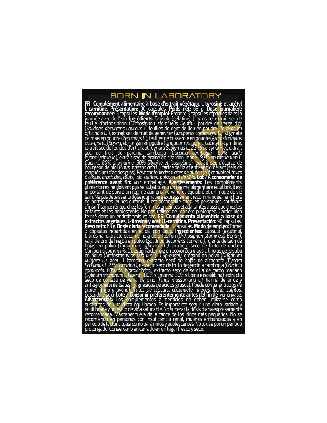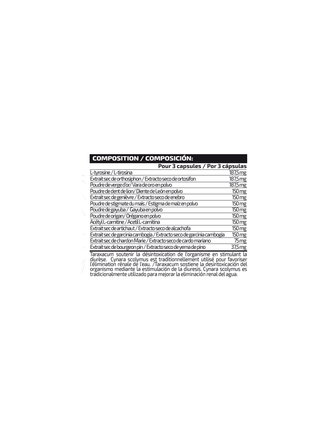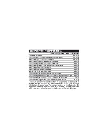 Ingredientes: Agentes de recubrimiento (sulfitos) (gelatina y colorantes (carbonato cálcico y octenil succinato sódico de almidón)), L-tirosina, extracto seco de ortosifon (Orthosiphon stamineus Benth), extracto seco de vara de oro (Solidago virgaurea L.), extracto seco de diente de león (Taraxacum officinale Web.), extracto seco de enebro (Juniperus communis, L), extracto seco de estigma de maiz (Zea mays L.), extracto seco de gayuba (Arctostaphylos uva-ursi (L.)), extracto seco de orégano (Origanum vulgare L.), acetil L-carnitina, extracto seco de alcachofa (Cynara scolymus L.), extracto seco de garcinia cambogia (Garcinia cambogia), extracto seco de cardo mariano (Silybum marianum Gaertn.), extracto seco de pino (Pinus massoniana L.), harina de arroz y antiaglomerante (estearato de magnesio). Puede contener trazas de gluten, huevos, leche, pescado y soja.