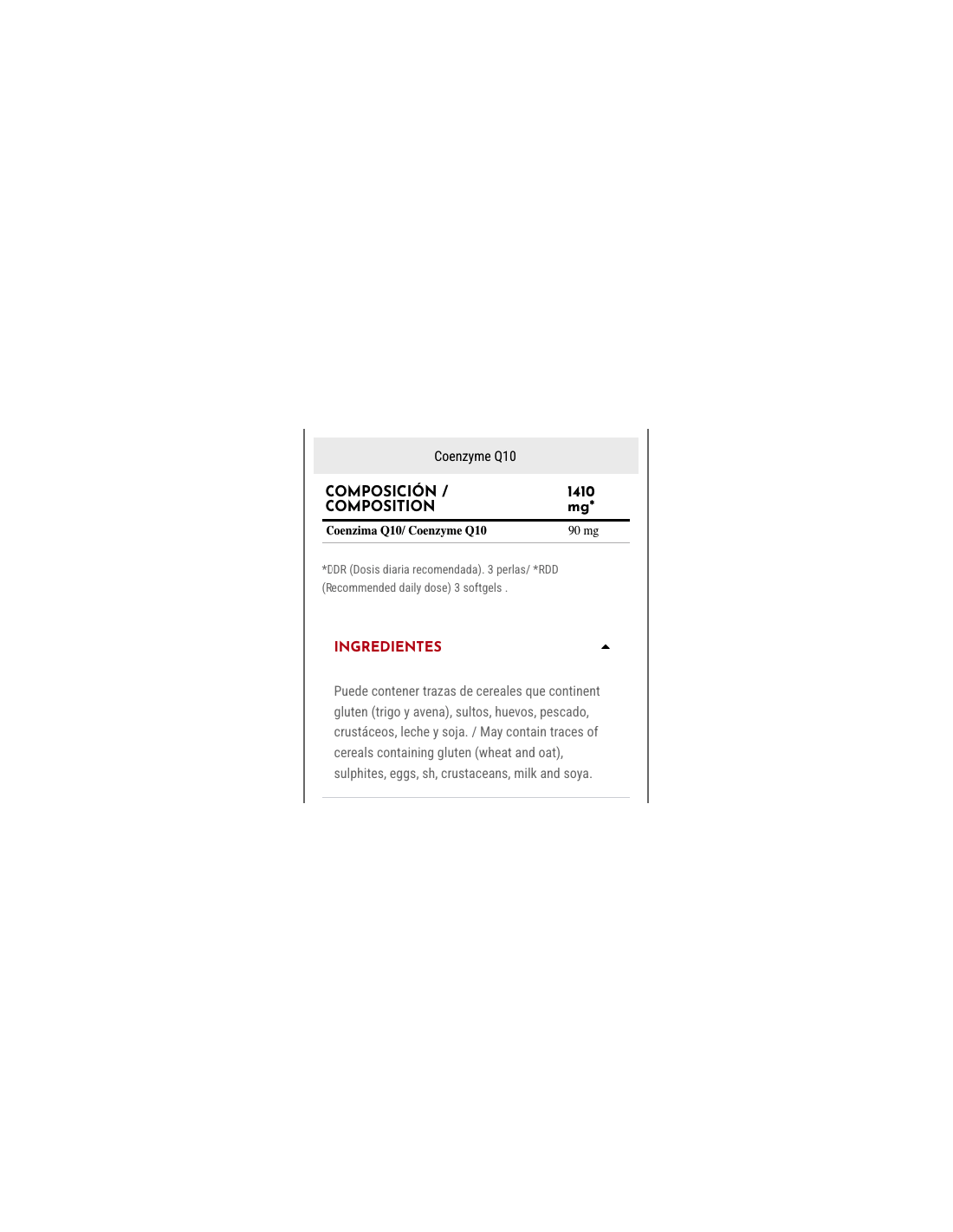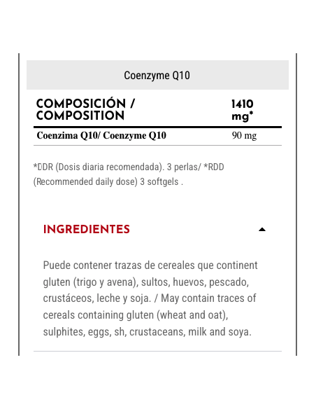 Coenzyme Q10, Complemento alimenticio a base de coenzima Q10. / Coenzyme Q10 food supplement.