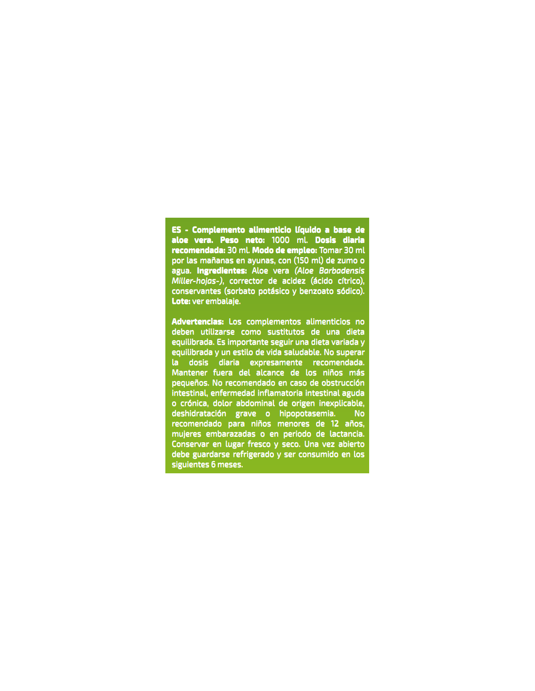 Aloe Vera 100% sin aditivos ni conservantes en su forma más pura para tomar directamente por las mañanas junto a zumo o agua.