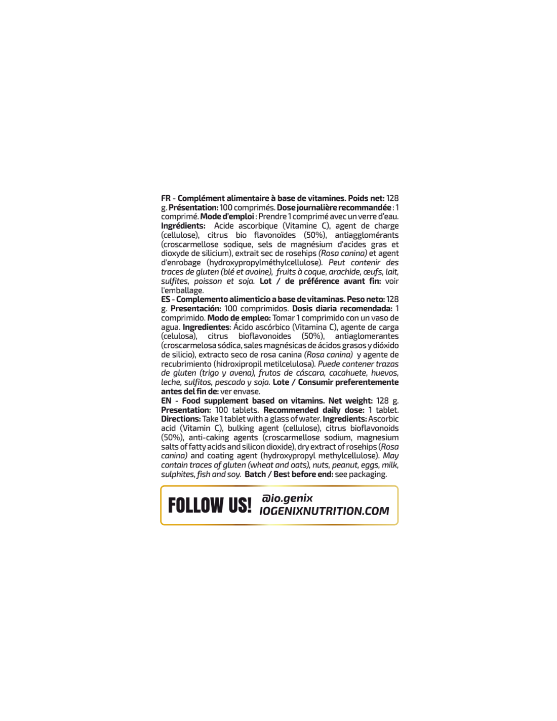 Ingredientes: Vitamina C (ácido ascórbico), agente de carga (celulosa microcristalina), citrus bioflavonoides (50%), antiaglome - rantes (croscarmelosa sódica, estearato de magnesio y dióxido de silicio), extracto seco de rosa canina (Rosa canina) y agente de recubrimiento (hidroxipropil metilcelulosa). Puede contener trazas de gluten, huevos, leche, pescado y soja. Lote / Consumir preferentemente antes del fin de: ver envase.