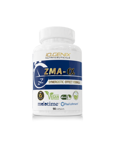 ZMA Alpha es un complemento alimenticio formulado con una combinación de minerales esenciales, aminoácidos y vitaminas en formas de alta biodisponibilidad, cuidadosamente seleccionadas. Su fórmula incluye magnesio en formas queladas, bisglicinato de zinc, L-triptófano y melatonina de liberación prolongada (Melotime™).