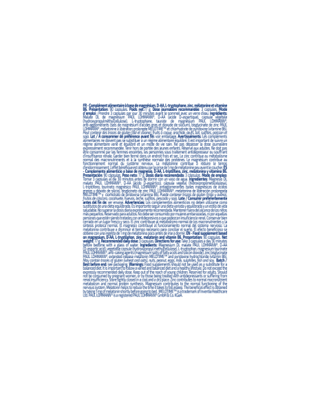El magnesio y el zinc son minerales fundamentales para numerosas funciones en el organismo. Además, la melatonina es un compuesto ampliamente estudiado por su papel en ayudar a conciliar el sueño* Por otro lado, el L-triptófano y el ácido D-aspártico son aminoácidos esenciales que participan en múltiples procesos metabólicos.