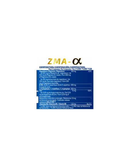 ZMA Alpha es un complemento alimenticio formulado con magnesio, zinc y vitamina B6, junto con aminoácidos como el ácido aspártico y melatonina de liberación secuencial, en formas seleccionadas para una óptima biodisponibilidad.