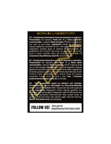 Ingredientes: Citrato de magnesio,agentes de recubrimiento (sulfitos) (gelatina y colorantes (carbonato cálcico y octenil succinato sódico de almidón)), picolinato de zinc, antiaglomerante (estearato de magnesio) y vitamina B6 (clorhidrato de piridoxina).Puede contener trazas de gluten, huevos, pescado, soja y leche.